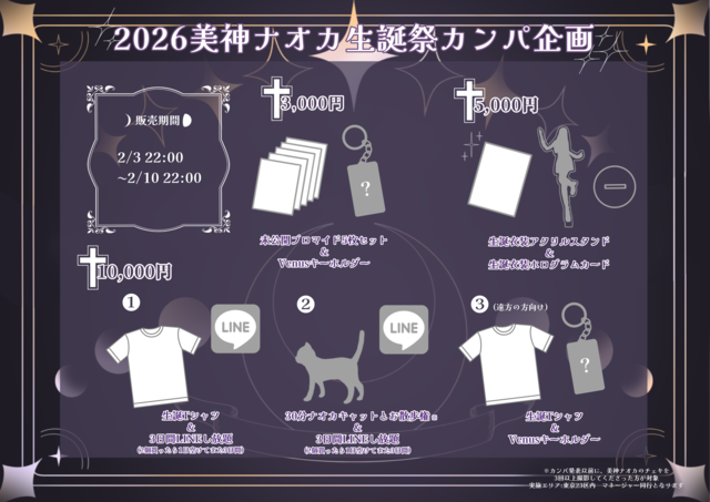 2026年2月23日に行われる美神ナオカ生誕祭 「美神崇拝 ~美神ナオカ生誕祭2026 ~」 広告ポスターカンパ Laynカンパは駅広告を出したい! という企画でカンパ募集させていただけたらと思います。 【特典内容】 ・生誕Tシャツ ・3日LINEし放題(2個買ったら1日空けてまた3日間) ※今回は個人やファンの方々での有志のフラスタなどの設置はお断りさせていただいております ※7割をカンパ企画費に当てさせていただきます。 ※購入制限はございません。 ※返金は行なっておりません。